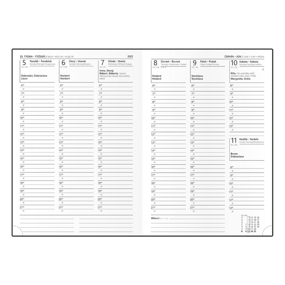Size: 143 x 205 mm Format: A5 Calendarium: weekly Czech and Slovak with names Language mutations: CZ, SK, ANG, D, RU Cover material: printed graphics, coated with matt laminate Paper: white with perforated corners Number of pages: 144 Binding: sewn