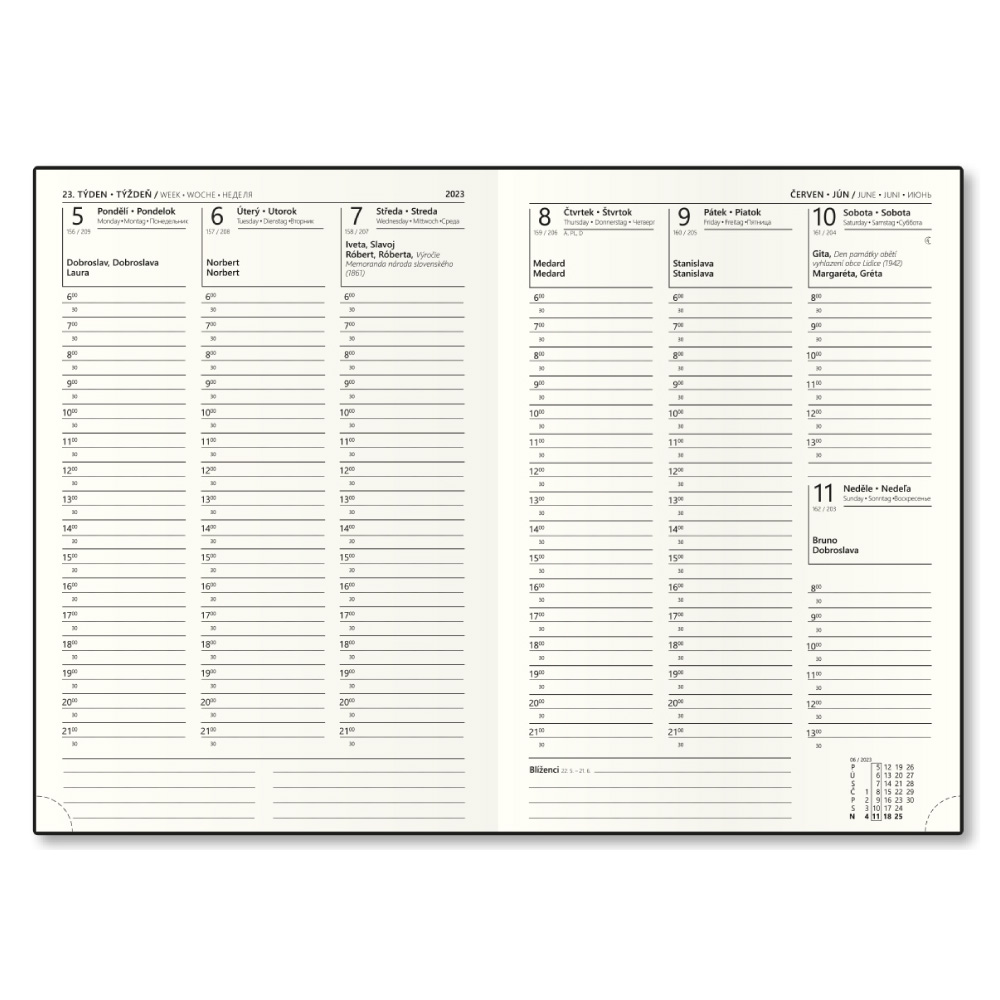 Size: 143 x 205 mm Format: A5 Calendarium: weekly Czech and Slovak with names Language mutations: CZ, SK, ANG, D, RU Cover material: fine smooth material with a glossy surface Paper: creame with perforated corners Number of pages: 144 Binding: sewn
