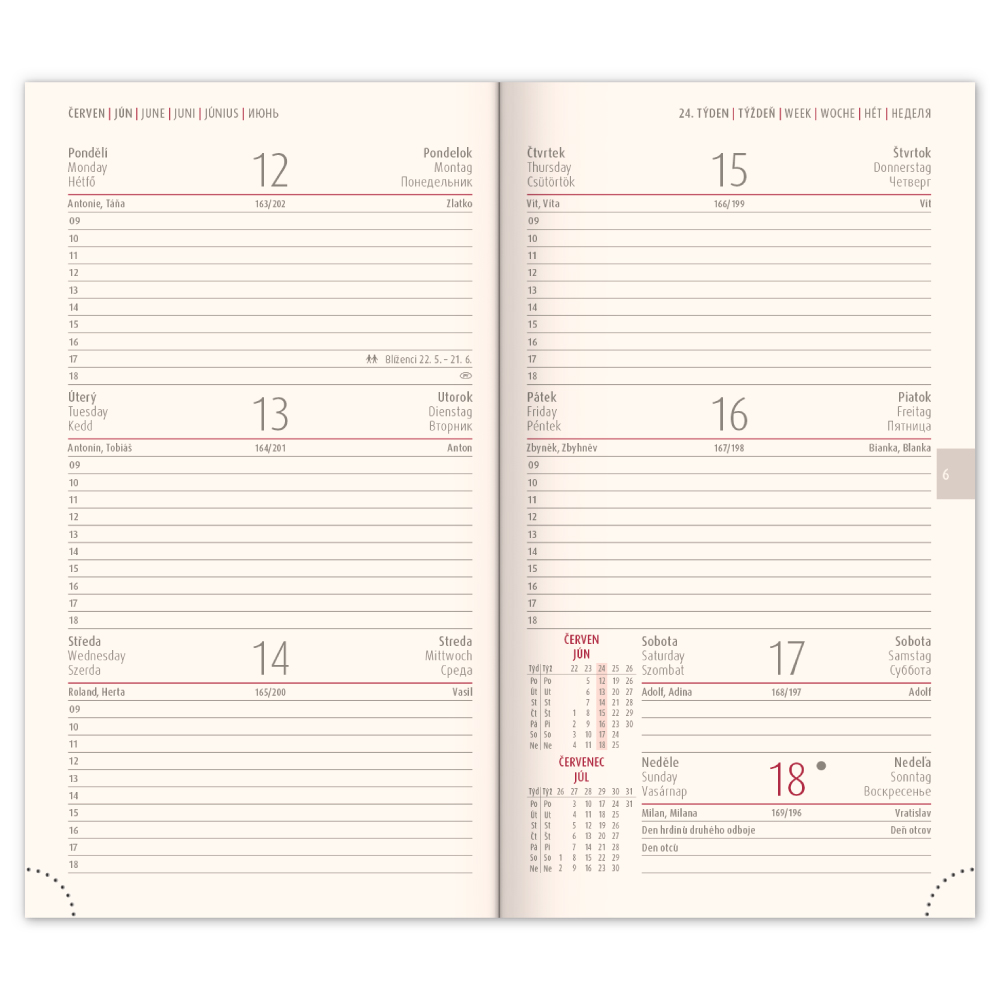 Size: 9 x 15 cm Format: pocket Calendarium: 6 language weekly from December 2022 (CZ, SK, GB, DE, HU, RU) Number of pages: 128 pages Material: fine structure reminiscent of a diamond cut Binding: hardcover Block color: creame The diary contains:
