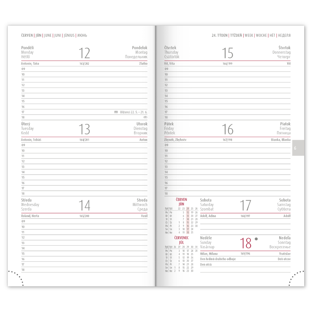 Size: 9 x 15 cm Format: pocket Calendarium: 6 language weekly from December 2022 (CZ, SK, GB, DE, HU, RU) Number of pages: 128 pages Material: smooth, matte leatherette Binding: hardcover Block color: white The diary contains: space for personal