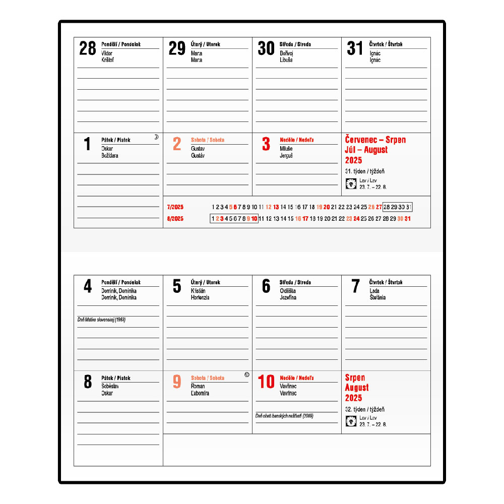 Dimension: 150 x 90 mm Format: pocket Calendar: weekly Czech and Slovak nominal Cover material: fine smooth PVC material Paper: white Number of pages: 72 Binding: stitched binding V1 The calendar includes: moon phases, seasons, summer and winter time, zo