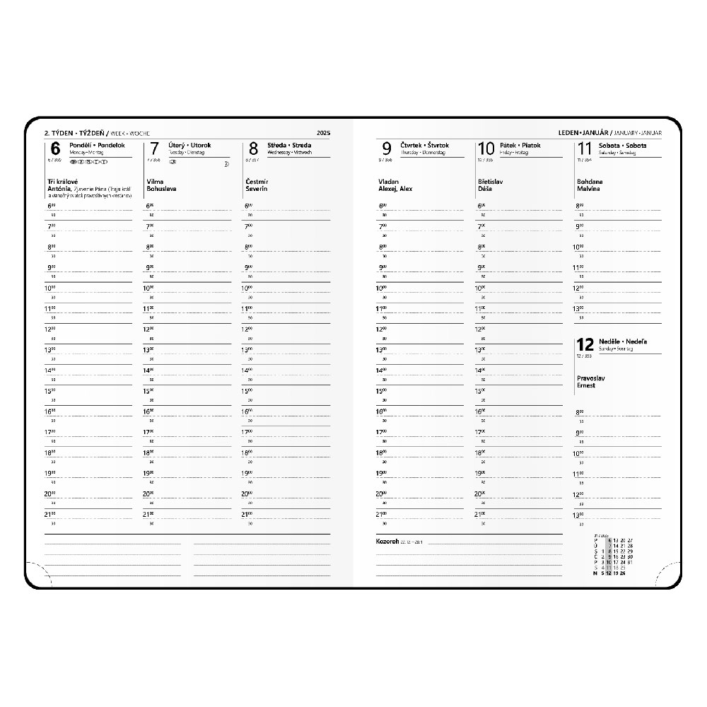 Dimension: 143 x 205 mm Format: A5 Calendar: weekly Czech and Slovak nominal Language mutations: CZ, SK, EN, DE Cover material: printed graphics on brown natural paper Paper: Natural Kraft with rounded rolls Number of pages: 144 Binding: V5 - Flex binding