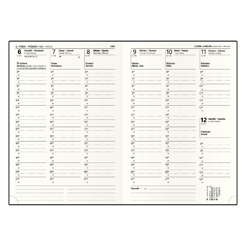 Dimension: 143 x 205 mm Format: A5 Calendar: weekly Czech and Slovak nominal Language mutations: CZ, SK, EN, DE Cover material: structured material with a glossy surface Paper: cream with perforated rolls Number of pages: 144 Binding: stitched V8 binding