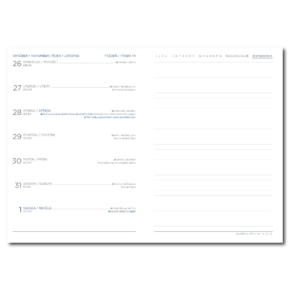 Dimension: 148 x 210 mm Format: A5 Calendar: Slovak weekly + one free page for notes Extent: 128 pages Paper: white Board material: vegan leather, PVC free Main language: Slovak Other languages: SK, EN, DE On order from 100 pcs Material of endpapers and