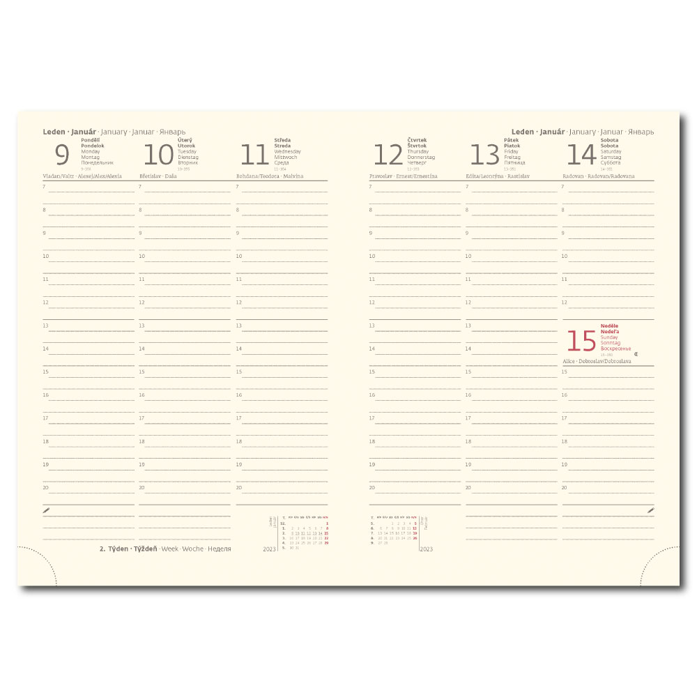Size: 145 x 205 mm Format: A5 Calendarium: weekly Czech/Slovak Number of Pages: 128 Block color: creame Binding: V8 Cover material: leatherette with a serrated structure Contains: personal data, holiday planner (monthly overview), planning calen
