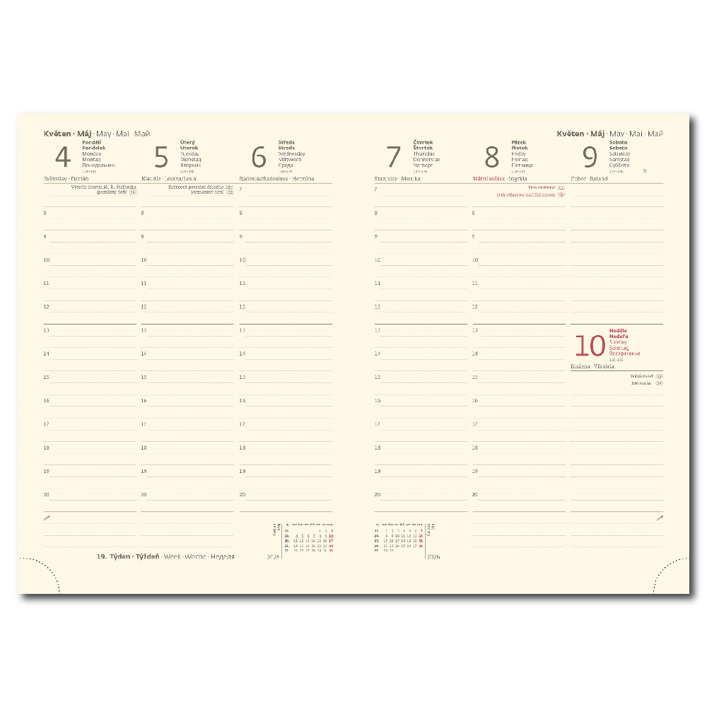 Size: 145 x 205 mm Format: A5 Calendarium: weekly Czech/Slovak Number of Pages: 128 Block color: creamy Binding: V8 Cover material: cork Contains: personal data, holiday planner (monthly overview), planning calendar, telephone prefixes, public ho