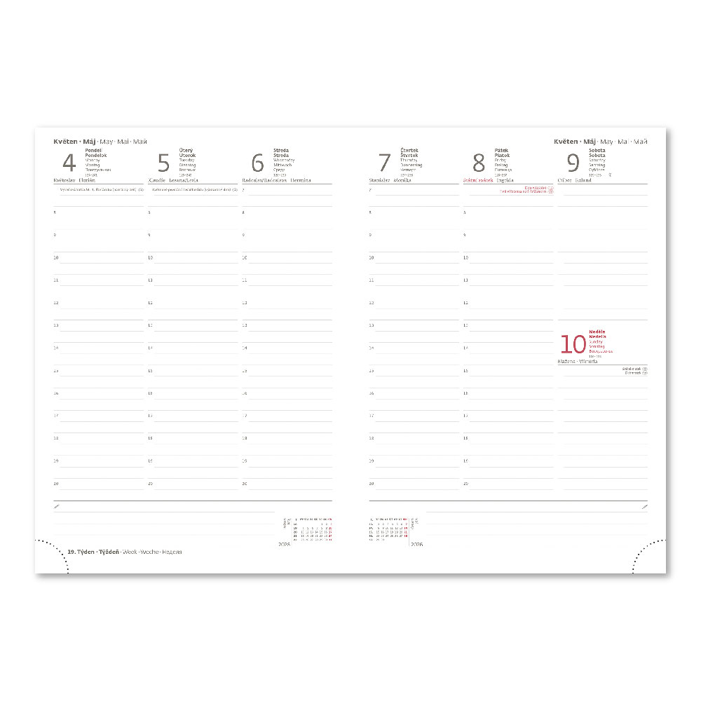 Size: 170 x 240 mm Format: B5 Calendarium: weekly Czech/Slovak Number of Pages: 128 Block color: white Binding: V8 Cover material: matt smooth treated paper Contains: personal data, holiday planner (monthly overview), planning calendar, telephone