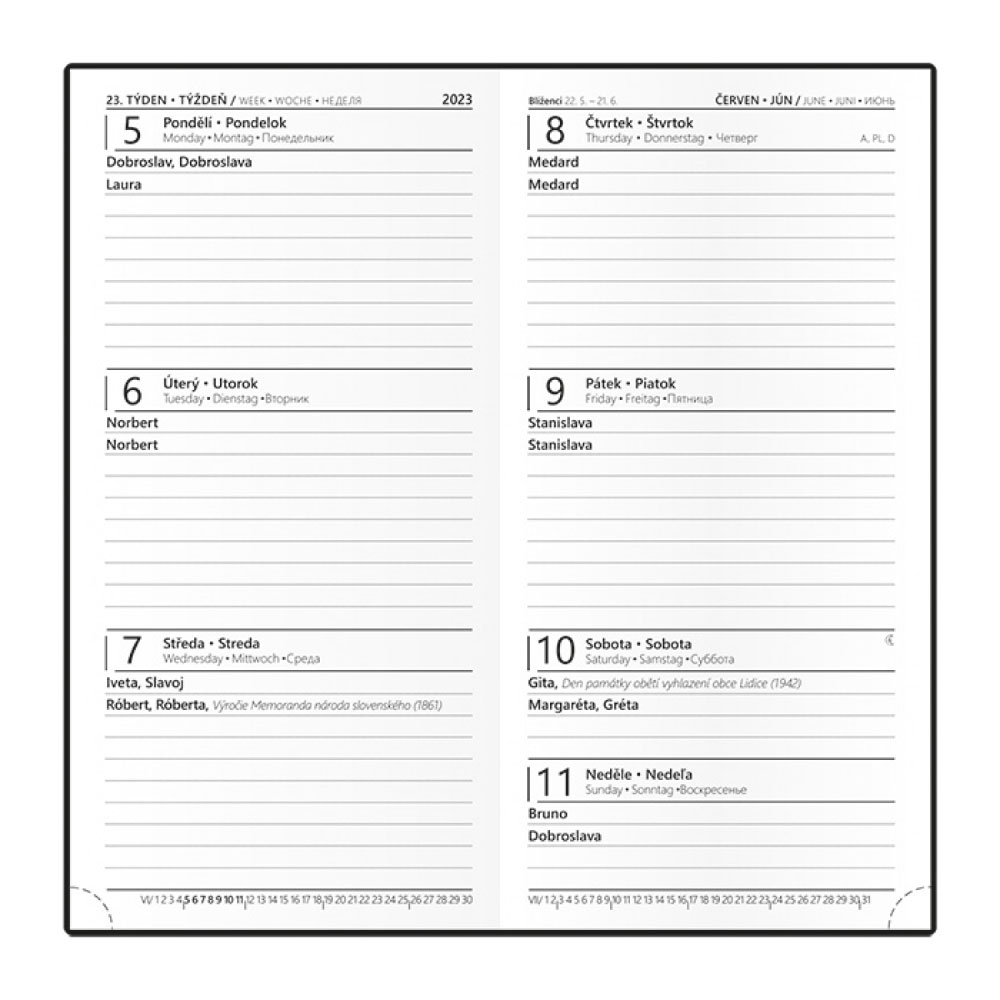 Size: 75 x 150 mm Format: pocket Calendarium: weekly Czech and Slovak with names Language mutations: CZ, SK, ANG, D, RU Cover material: structured material Paper: white with perforated corners Number of pages: 128 Binding: sewn binding V8 Bookmar
