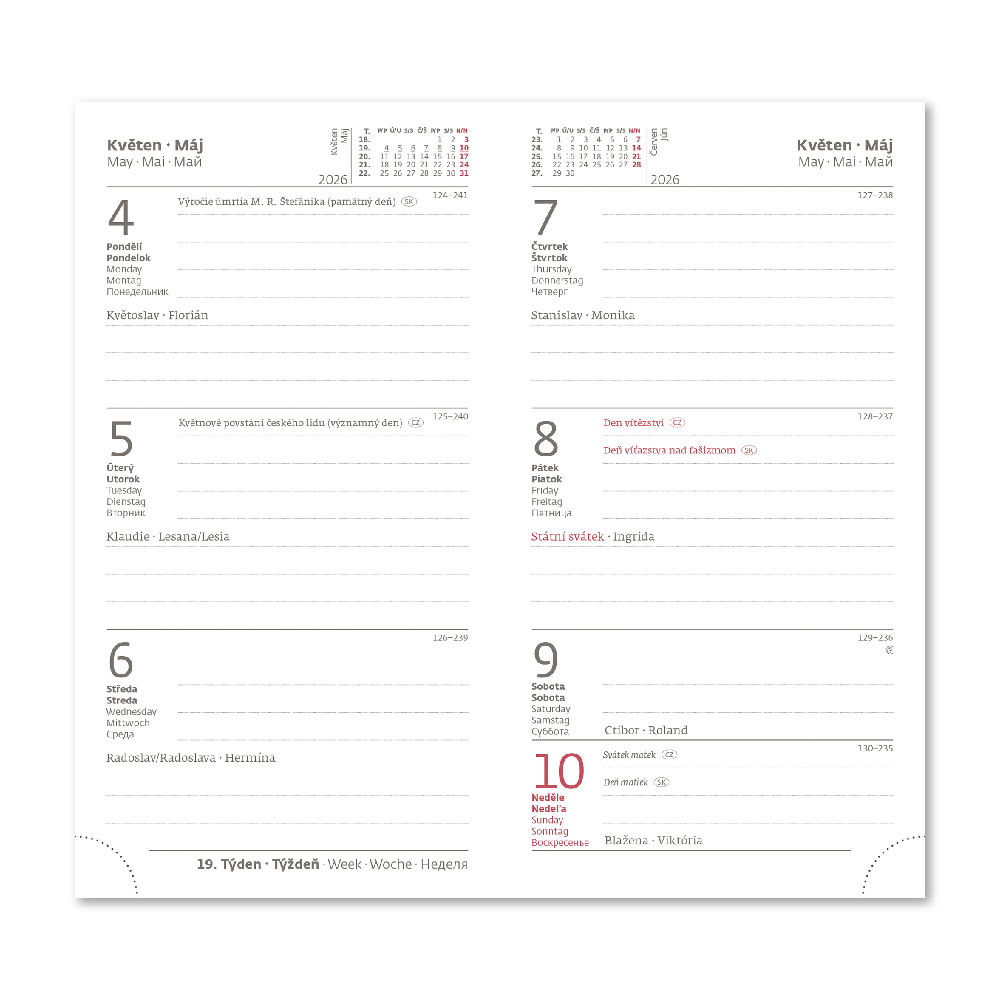 Size: 80 x 150 mm Format: pocket Calendarium: weekly Czech/Slovak Number of Pages: 128 Block color: white Binding: V8 Cover material: lamination with silk effect Contains: personal data, holiday planner (monthly overview), planning calendar, Czec